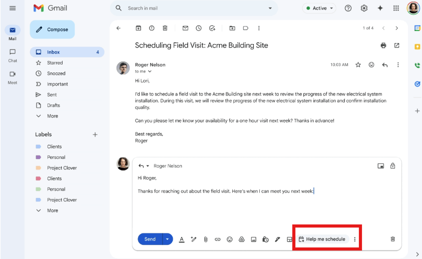 Gmail with Gemini will detect when you’re trying to coordinate a time within an email and will surface a Help me schedule button in the toolbar. After you click on the Help me schedule button, Gemini will automatically suggest ideal slots based on your Google Calendar and the email's context. For example, if someone asks for a 30 minute meeting next week, Gemini will recommend time slots that fit your availability.